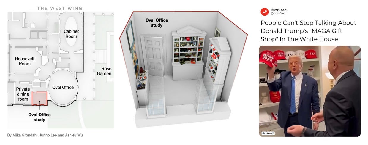 I don’t know if you’ve seen photos of the White House room that’s decorated like a shopfront with shelves of MAGA hats and merch, but that’s the Oval Office study, a room just off to the side of the Oval Office. The New York Times did a deep dive photo essay on the room through history, which has been used by past presidents as an office and was infamous for being a meeting place during that Clinton scandal.